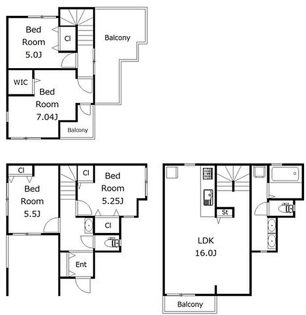 間取り内訳:リビングダイニングキッチン 16帖(2階)・洋室 5.5帖(1階)・洋室 5.2帖(1階)・洋室 7帖(3階)・洋室 5帖(3階)