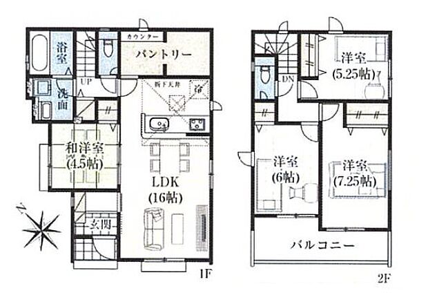 | 間取り | 4LDK 間取り内訳:洋室 7.2帖(2階)・洋室 6帖(2階)・洋室 5.2帖(2階)・和室 4.5畳(1階)・リビングダイニングキッチン 16帖(1階) |