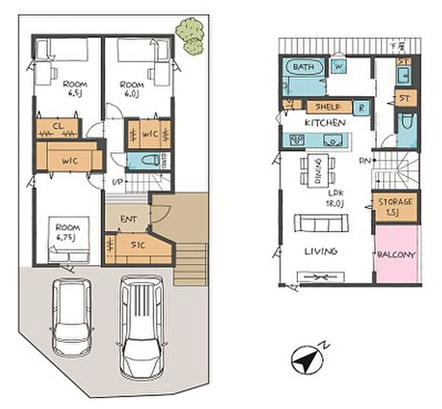 | 間取り | 3LDK 間取り内訳:洋室 6帖(1階)・洋室 6.5帖(1階)・洋室 6.7帖(1階)・リビングダイニングキッチン 18帖(2階) |