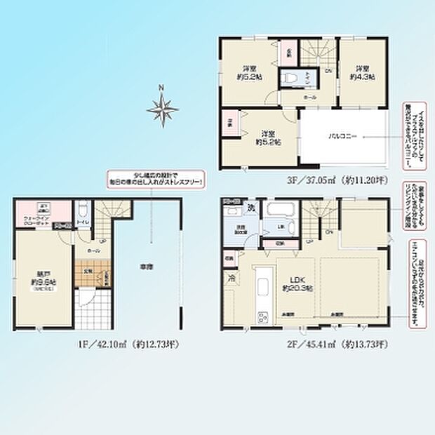 | 間取り | 3SLDK 間取り内訳:収納 9.6帖・リビングダイニングキッチン 20.3帖・洋室 5.2帖・洋室 4.3帖・洋室 5.2帖 |