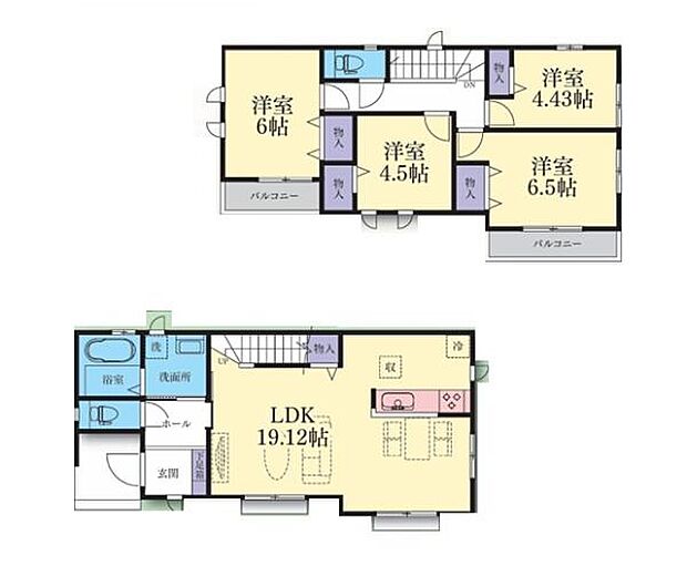 | 間取り | 4LDK 間取り内訳:リビングダイニングキッチン 19.1帖(1階)・洋室 6帖(2階)・洋室 4.5帖(2階)・洋室 6.5帖(2階)・洋室 4.4帖(2階) |