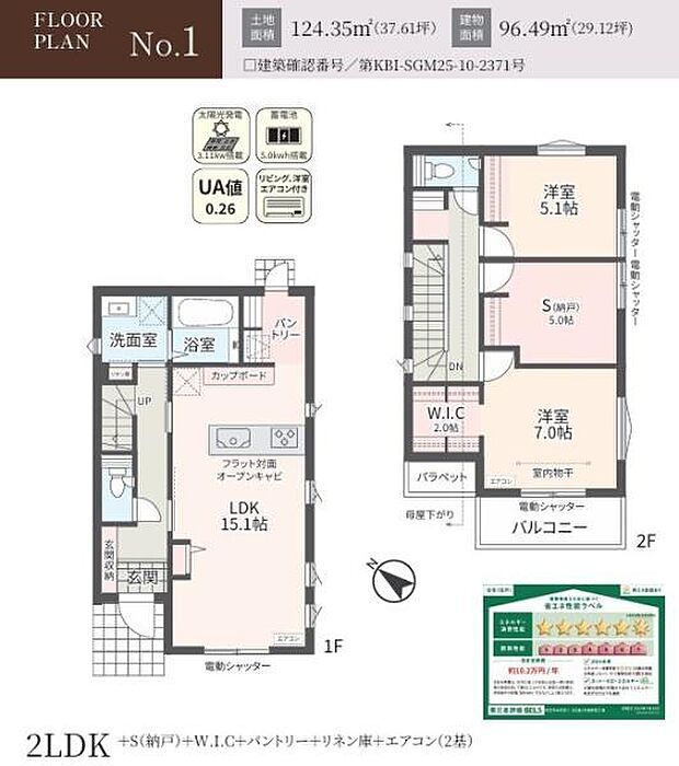 | 間取り | 2SLDK 間取り内訳:リビングダイニングキッチン 15.1帖(1階)・洋室 7帖(2階)・洋室 5.1帖(2階)・収納 5帖(2階) |
