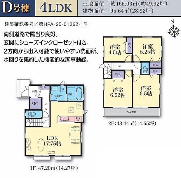 間取り内訳:リビングダイニングキッチン 17.7帖(1階)・洋室 6.6帖(2階)・洋室 6.5帖(2階)・洋室 5.2帖(2階)・洋室 4.5帖(2階)