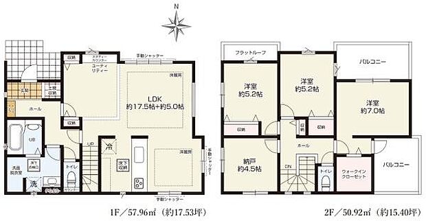 間取り内訳:リビングダイニングキッチン 22.5帖(1階)・洋室 7帖(2階)・洋室 5.2帖(2階)・洋室 5.2帖(2階)・収納 4.5帖(2階)