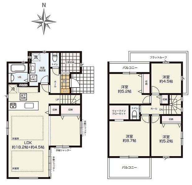 | 間取り | 4LDK 間取り内訳:洋室 5.2帖(2階)・洋室 4.5帖(2階)・リビングダイニングキッチン 22.7帖(1階)・洋室 8.7帖(2階)・洋室 5.2帖(2階) |