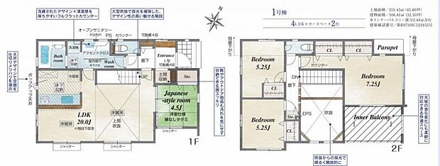 | 間取り | 4LDK 間取り内訳:リビングダイニングキッチン 20帖(1階)・和室 4.5畳(1階)・洋室 7.2帖(2階)・洋室 5.2帖(2階)x2 |