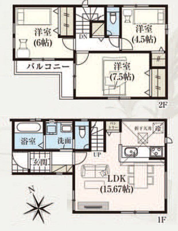 | 間取り | 3LDK 間取り内訳:リビングダイニングキッチン 15.6帖(1階)・洋室 7.5帖(2階)・洋室 6帖(2階) |