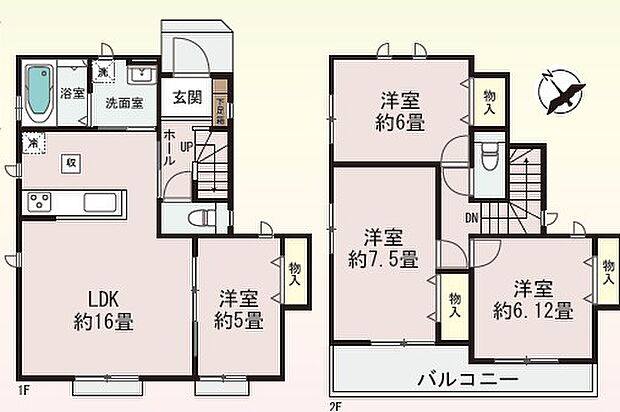| 間取り | 4LDK 間取り内訳:リビングダイニングキッチン 16帖(1階)・洋室 5帖(1階)・洋室 7.5帖(2階)・洋室 6.1帖(2階)・洋室 6帖(2階) |