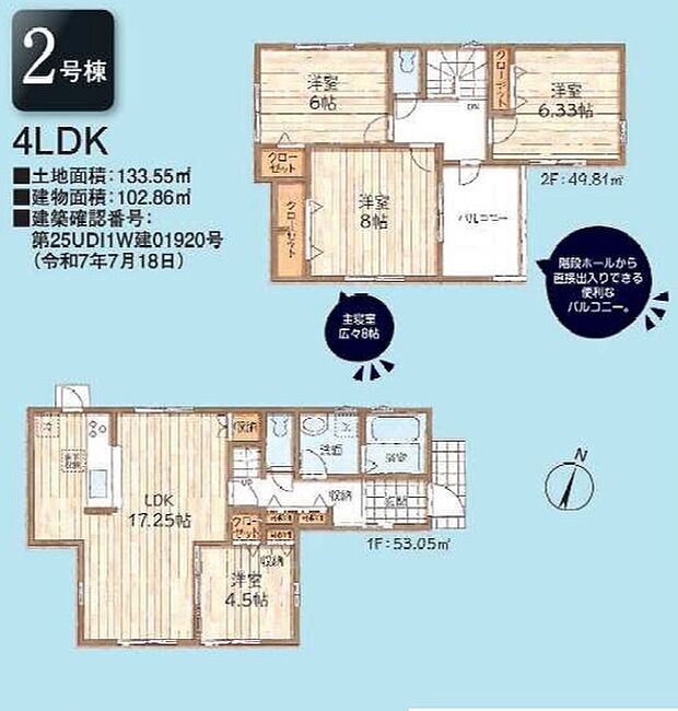 間取り内訳:リビングダイニングキッチン(1階)・洋室 4.5帖(1階)・洋室 8帖(2階)・洋室 6.3帖(2階)・洋室 6帖(2階)