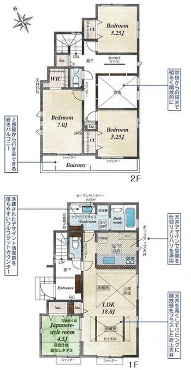 | 間取り | 4LDK 間取り内訳:リビングダイニングキッチン 18帖(1階)・和室 4.5畳(1階)・洋室 7帖(2階)・洋室 5.2帖(2階)x2 |