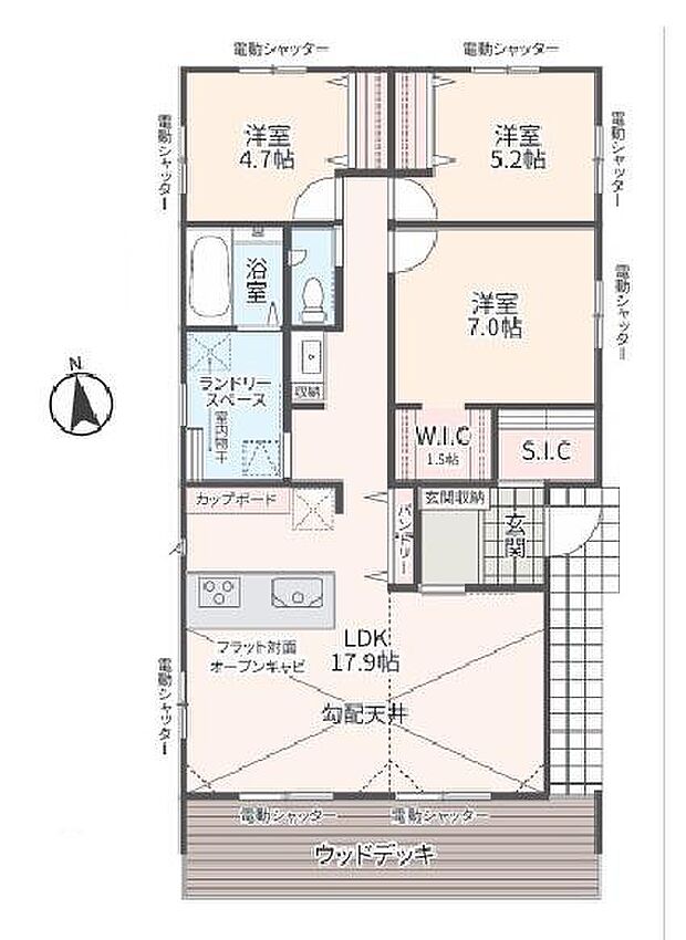 理想の暮らしをワンフロアで味わう平屋建て。開放的なウッドデッキあり。収納豊富な3LDK。