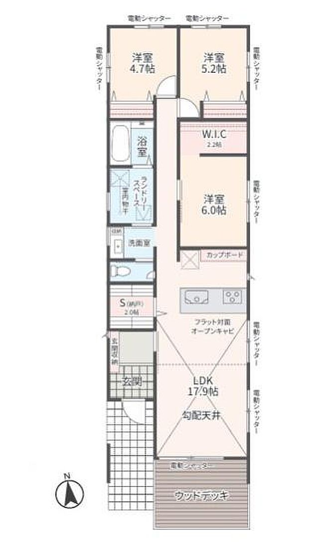 理想の暮らしをワンフロアで味わう平屋建て。開放的なウッドデッキあり。収納豊富な3LDK。