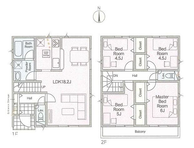 | 間取り | 4LDK 間取り内訳:リビングダイニングキッチン 18.2帖(1階)・洋室 4.5帖(2階)・洋室 5帖(2階)・洋室 6帖(2階)・洋室 4.5帖(2階) |