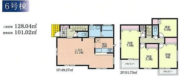 | 間取り | 4LDK 間取り内訳:リビングダイニングキッチン 21.2帖(1階)・洋室 7.5帖(2階)・洋室 6帖(2階)・洋室 5.3帖(2階)・洋室 4.5帖(2階) |