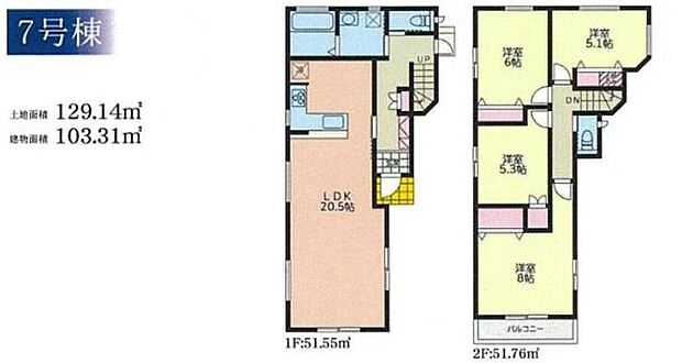 | 間取り | 4LDK 間取り内訳:リビングダイニングキッチン 20.5帖(1階)・洋室 8帖(2階)・洋室 6帖(2階)・洋室 5.3帖(2階)・洋室 5.1帖(2階) |