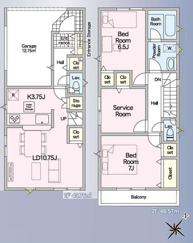 間取り内訳:リビングダイニングキッチン 14.5帖(1階)・洋室 7帖(2階)・洋室 6.5帖(2階)