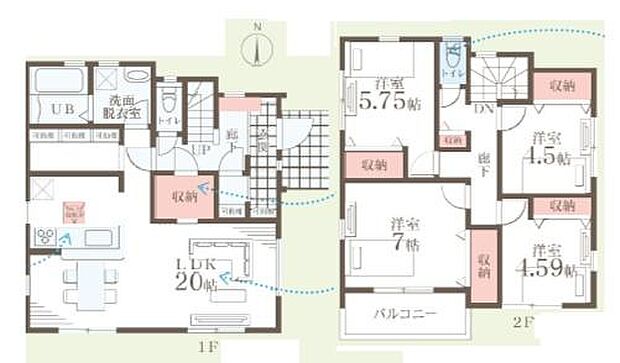 間取り内訳:リビングダイニングキッチン 20帖(1階)・洋室 5.7帖(2階)・洋室 7帖(2階)・洋室 4.5帖(2階)・洋室 4.5帖(2階)