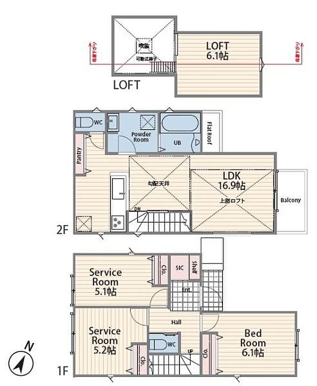 | 間取り | 1SLDK 間取り内訳:収納 5.1帖(1階)・収納 5.2帖(1階)・洋室 6.1帖(1階)・リビングダイニングキッチン 16.9帖(2階) |