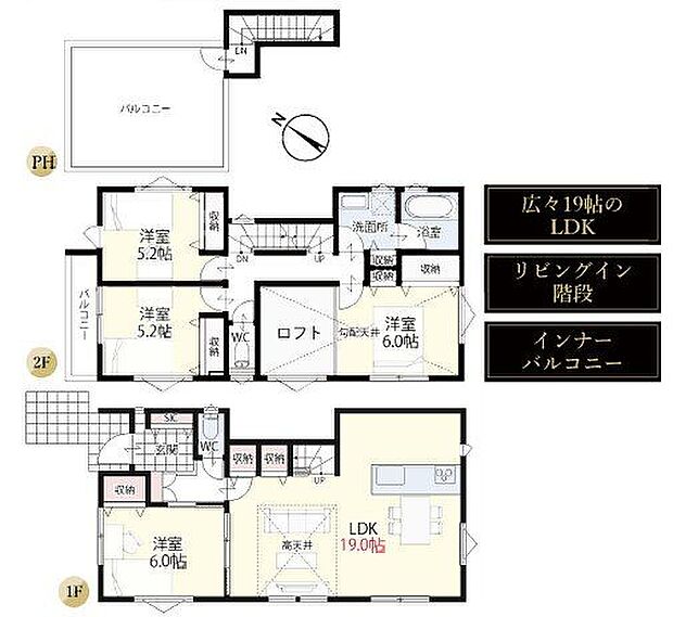 | 間取り | 4LDK 間取り内訳:リビングダイニングキッチン 19帖(1階)・洋室 6帖(1階)・洋室 5.2帖(2階)・洋室 6帖(2階) |