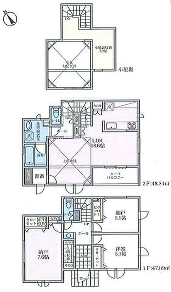 | 間取り | 1SLDK 間取り内訳:リビングダイニングキッチン 18.6帖(2階)・洋室 5.1帖(1階)・収納 7.6帖(1階)・収納 5.1帖(1階)・その他 7.2帖 |