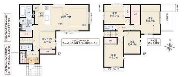 | 間取り | 4LDK 間取り内訳:リビングダイニングキッチン 21.7帖(1階)・洋室 5.2帖(2階)・洋室 5.7帖(2階)・洋室 4.3帖(2階)・洋室 9.7帖(2階) |