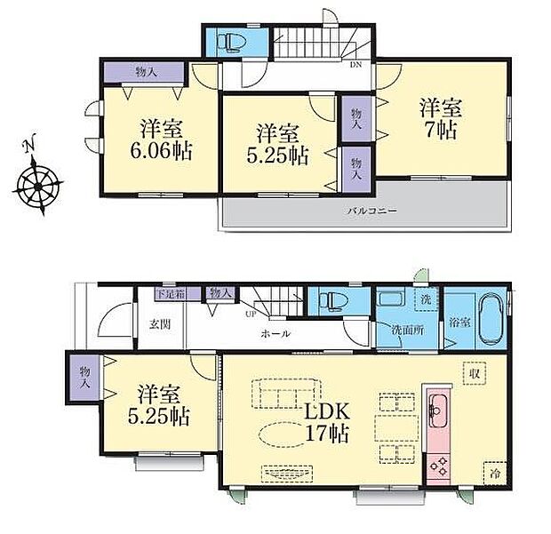 | 間取り | 4LDK 間取り内訳:リビングダイニングキッチン 17帖(1階)・洋室 5.2帖(1階)・洋室 6帖(2階)・洋室 5.2帖(2階)・洋室 7帖(2階) |