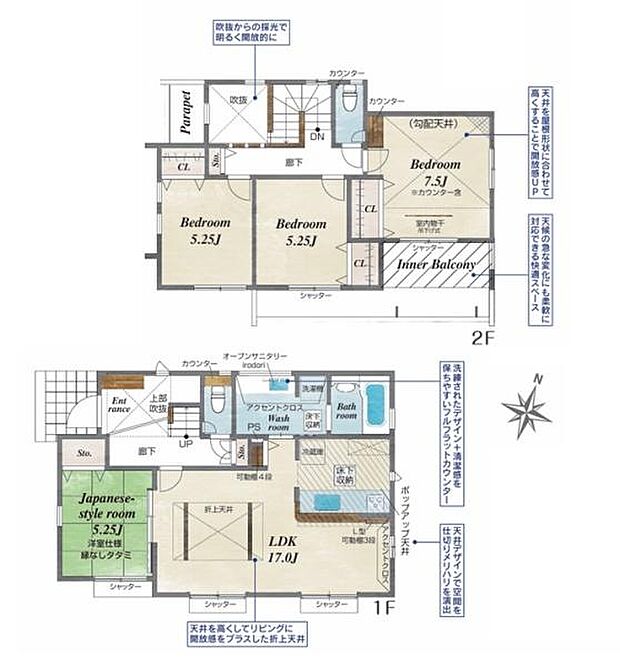 | 間取り | 4LDK 間取り内訳:リビングダイニングキッチン 17帖(1階)・和室 5.2畳(1階)・洋室 5.2帖(2階)・洋室 5.2帖(2階)・洋室 7.5帖(2階) |