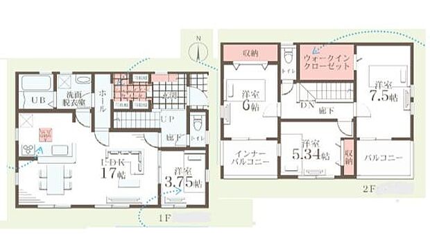 | 間取り | 3SLDK 間取り内訳:リビングダイニングキッチン 17帖(1階)・収納 3.7帖(1階)・洋室 6帖(2階)・洋室 5.3帖(2階)・洋室 7.5帖(2階) |