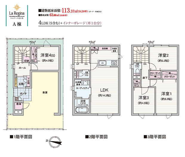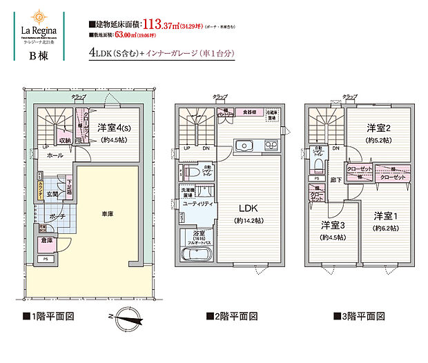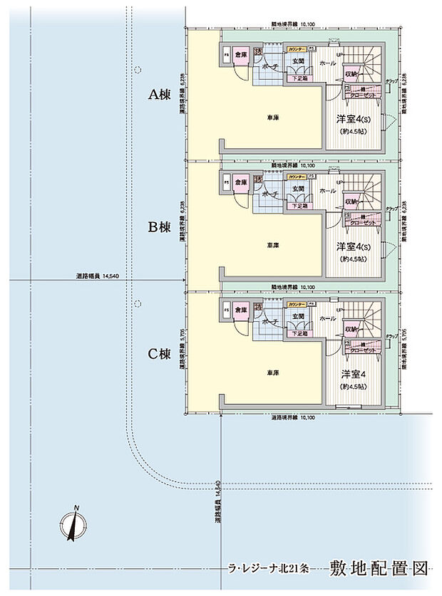 | 間取り | C棟:4LDK+インナーガレージ、A・B棟 :4LDK(S含む)+インナーガレージ |