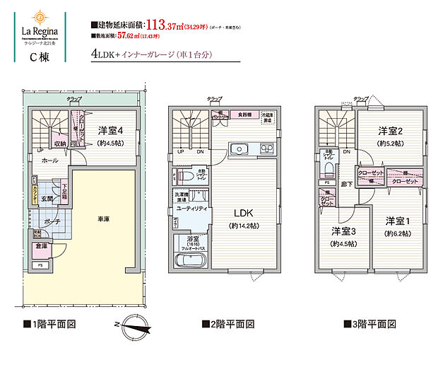 | 間取り | C棟:4LDK+インナーガレージ、A・B棟 :4LDK(S含む)+インナーガレージ | 建物階 | 木造(W造)地上3階建 |