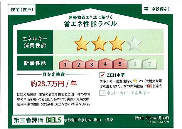 - 星マークの数が多いほどエネルギー消費性能が高いことを示しています。再エネ設備のない住宅は★0~★4の5段階評価、再エネ設備がある住宅は★0~★6の7段階評価となります。