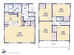 | 間取り | 4LDK 間取り内訳:リビングダイニングキッチン 20帖(1階)・洋室 5.2帖(2階)・洋室 6.7帖(2階)・洋室 5.2帖(2階)・洋室 6.2帖(2階) |