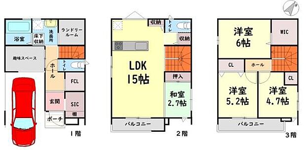| 間取り | 3LDK 間取り内訳:リビングダイニングキッチン 15帖(2階)・和室 2.7畳(2階)・洋室 6帖(3階)・洋室 5.2帖(3階)・和室 4.7畳(3階) |