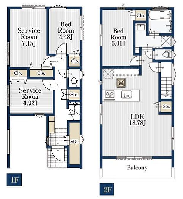 | 間取り | 2SLDK 間取り内訳:収納 7.1帖(1階)・収納 4.9帖(1階)・洋室 4.4帖(1階)・洋室 6帖(2階)・リビングダイニングキッチン 18.7帖(2階) |