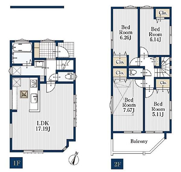 | 間取り | 4LDK 間取り内訳:リビングダイニングキッチン 17.1帖(1階)・洋室 6.2帖(2階)・洋室 7.6帖(2階)・洋室 5.1帖(2階)・洋室 6.1帖(2階) |