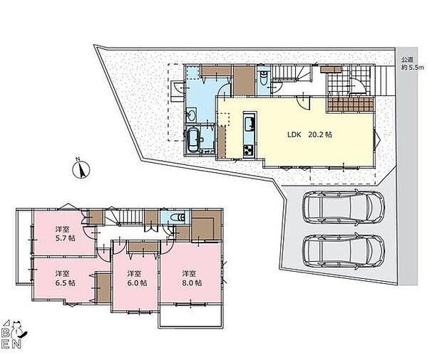 | 間取り | 4LDK 間取り内訳:洋室 8帖(2階)・洋室 6.5帖(2階)・洋室 6帖(2階)・洋室 5.7帖(2階)・リビングダイニングキッチン 20.2帖(1階) |