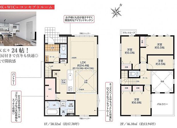 | 間取り | 4LDK 間取り内訳:リビングダイニングキッチン 24.4帖(1階)・洋室 6.8帖(2階)・洋室 5.5帖(2階)・洋室 5帖(2階)・洋室 3.5帖(2階) |