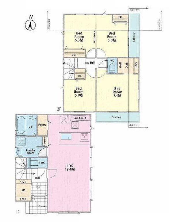 | 間取り | 3LDK 間取り内訳:リビングダイニングキッチン 18.4帖(1階)・洋室 5.1帖(2階)・洋室 7.4帖(2階)・洋室 10.8帖(2階) |