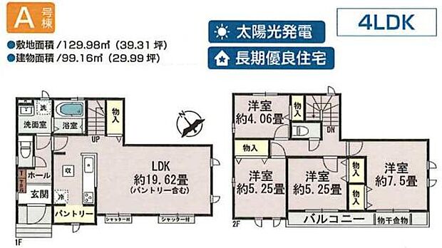 | 間取り | 4LDK 間取り内訳:リビングダイニングキッチン 19.6帖(1階)・洋室 7.5帖(2階)・洋室 5.2帖(2階)・洋室 5.2帖(2階)・洋室 4帖(2階) |