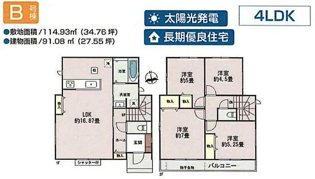 | 間取り | 4LDK 間取り内訳:リビングダイニングキッチン 16.8帖(1階)・洋室 7帖(2階)・洋室 5.2帖(2階)・洋室 5帖(2階)・洋室 4.5帖(2階) |