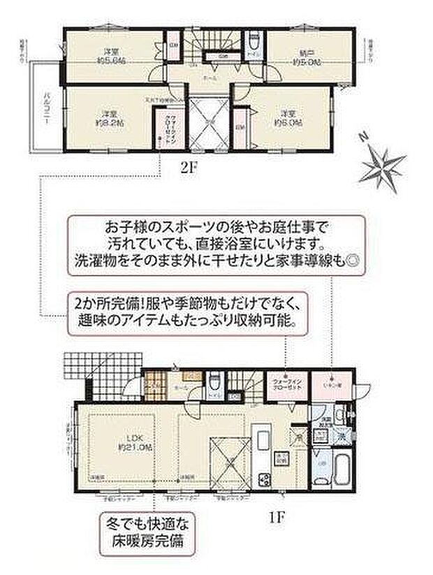 | 間取り | 3SLDK 間取り内訳:リビングダイニングキッチン 21帖(1階)・洋室 5帖(2階)・収納 5帖(2階)・洋室 6帖(2階)・洋室 8.2帖(2階) |