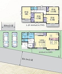| 間取り | 4LDK 間取り内訳:リビングダイニングキッチン 19帖(1階)・洋室 6帖(2階)x2・洋室 4帖(2階)x2 |