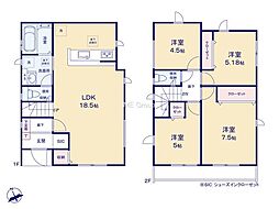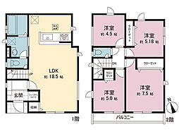 | 間取り | 4LDK 間取り内訳:リビングダイニングキッチン 18帖(1階)・洋室 4.5帖(2階)x2・洋室 6.7帖(2階)・洋室 6.2帖(2階) |