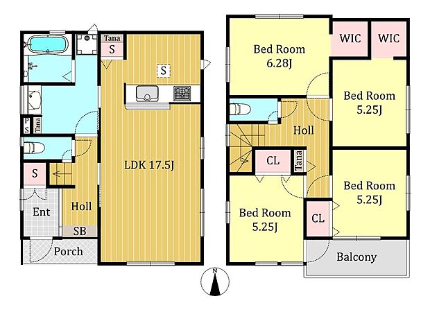 | 間取り | 4LDK 間取り内訳:リビングダイニングキッチン 17.5帖(1階)・洋室 5.2帖(2階)x3・洋室 6.2帖(2階) |