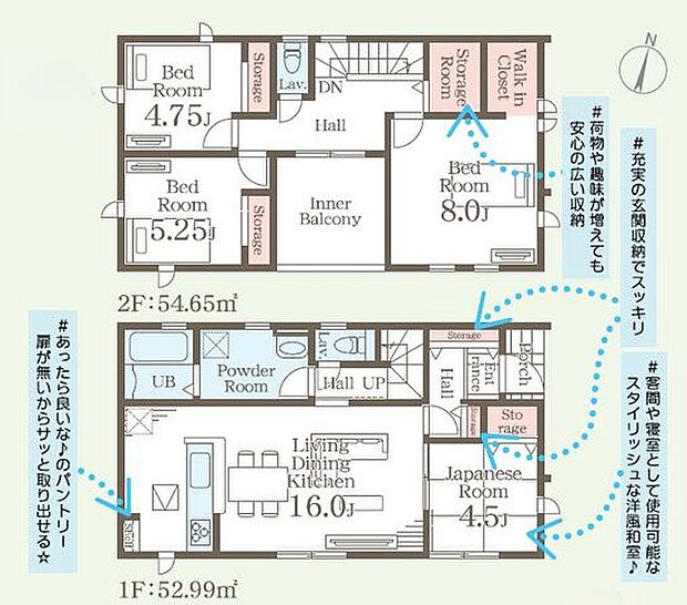 | 間取り | 4LDK 間取り内訳:リビングダイニングキッチン 16帖(1階)・和室 4.5畳(1階)・洋室 8帖(2階)・洋室 5.2帖(2階)・洋室 4.7帖(2階) |