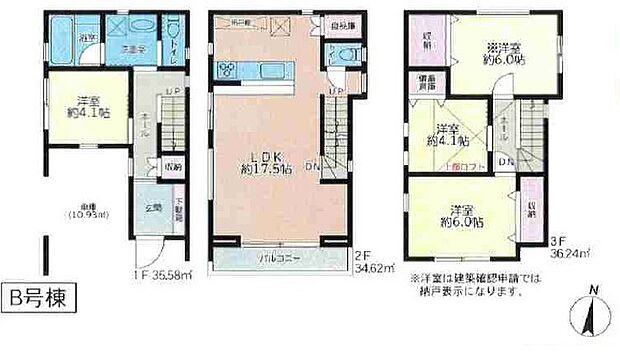 | 間取り | 4LDK 間取り内訳:洋室 6帖(3階)・洋室 6帖(3階)・洋室 4.1帖(3階)・リビングダイニングキッチン 17.5帖(2階)・洋室 4.3帖(1階) |