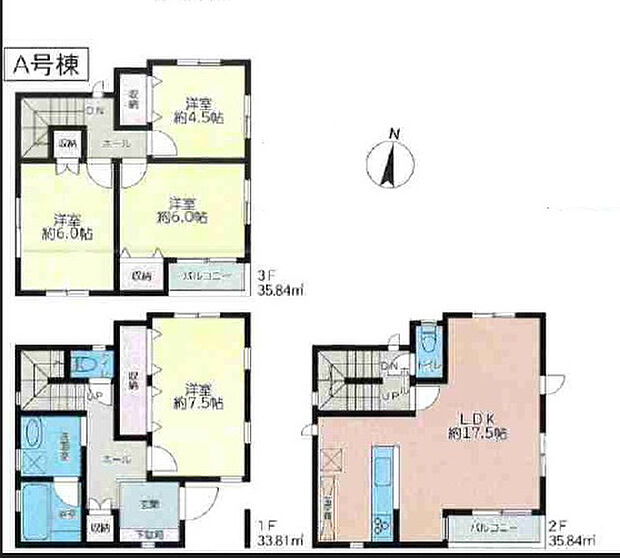 | 間取り | 4LDK 間取り内訳:洋室 6帖(3階)・洋室 6帖(3階)・洋室 4.5帖(3階)・リビングダイニングキッチン 17.5帖(2階)・洋室 7.5帖(1階) |