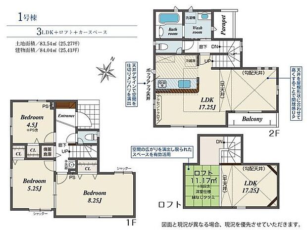 | 間取り | 3LDK(ロフト11.17m2) 間取り内訳:洋室 8.2帖(1階)・洋室 5.2帖(1階)・洋室 4.5帖(1階)・リビングダイニングキッチン 17.2帖(2階) |