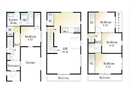 | 間取り | 3LDK 間取り内訳:リビングダイニングキッチン 19.2帖(2階)・洋室 10帖(3階)・洋室 7.9帖(3階)・洋室 4.5帖(1階) |