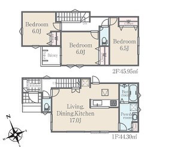 | 間取り | 3LDK 間取り内訳:リビングダイニングキッチン 17帖(1階)・洋室 6帖(2階)x2・洋室 6.5帖(2階) |
